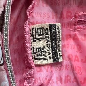 Charming pink Harajuku Lowers mini backpack. There is a slight yellow stain on the inside and a black smudge on the outside. 14.5 in tall, base measure 4in and width is 10in. Has adjustable backpack straps.