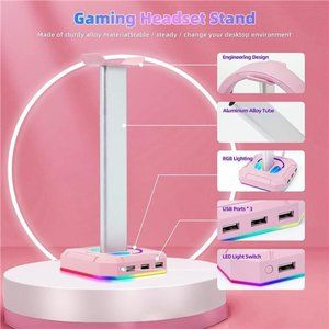 Pink Headphone Stand RGB Lights GamingHeadset Holder with 3USB Port for Charging