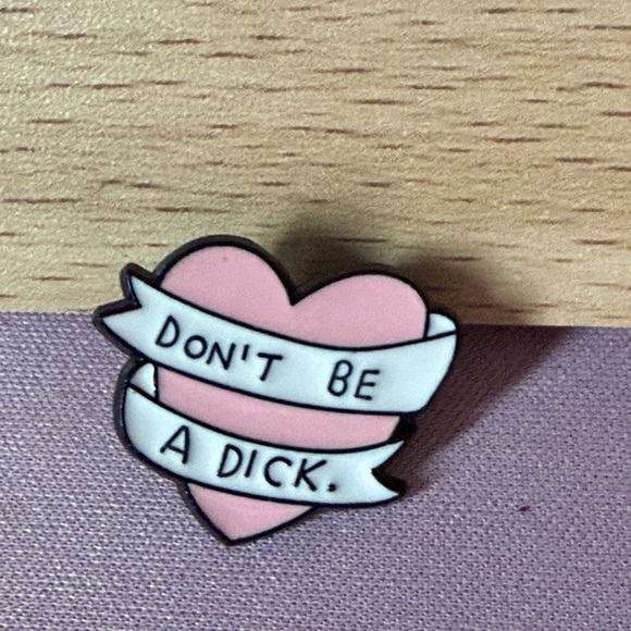 Cute pink heart enamel pin with a playful message. Perfect for adding a fun touch to your outfit.