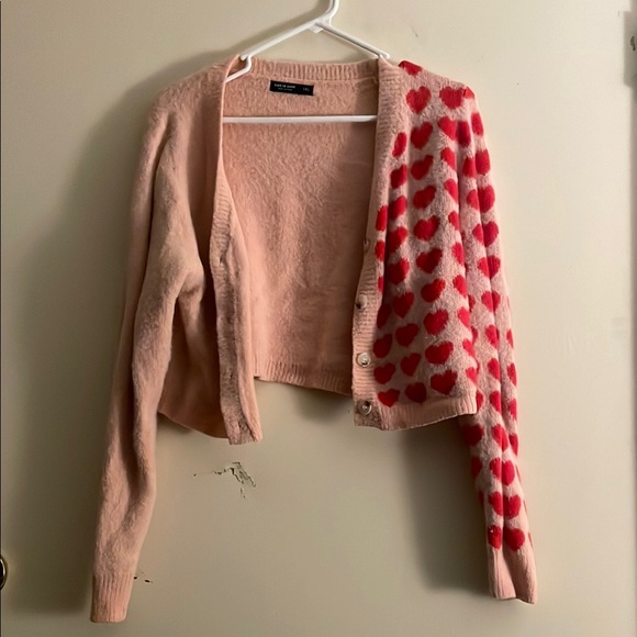 Stay cozy and stylish with this charming pink sweater featuring a playful heart pattern. Perfect for adding a touch of fun to your wardrobe. It is cropped and a bit staticy but soft perfect for dresses or high waisted jeans