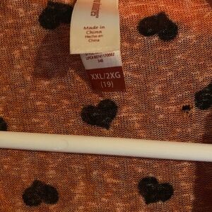 Stylish orange button-up shirt with black heart patterns. Features rolled-up sleeves and a relaxed fit.