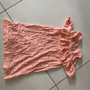 Adorable pink dress with heart patterns. Features a ruffled shoulder design.