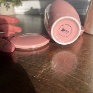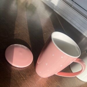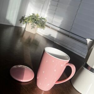 Charming pink mug with a delicate heart pattern. Perfect for coffee or tea.