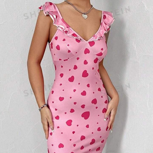 Charming pink dress with heart prints and ruffle details. Perfect for a playful and stylish look.