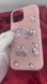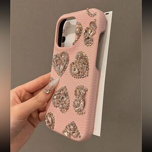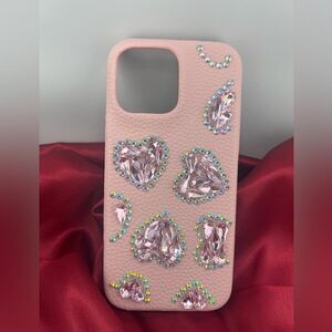 Stylish pink phone case with heart-shaped crystal embellishments. Perfect for adding a touch of glamour to your device.