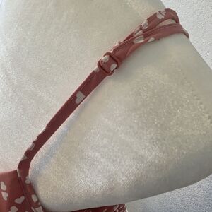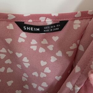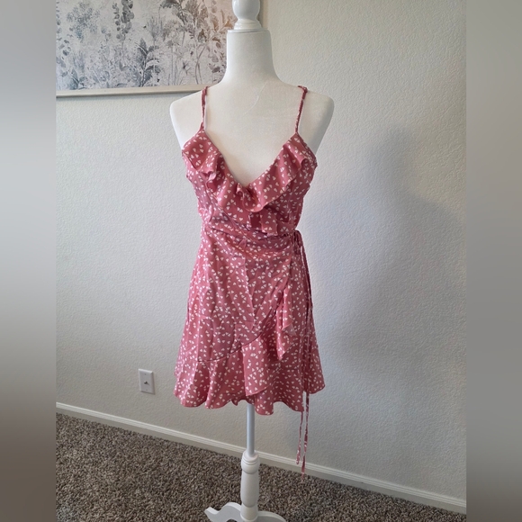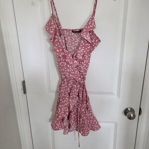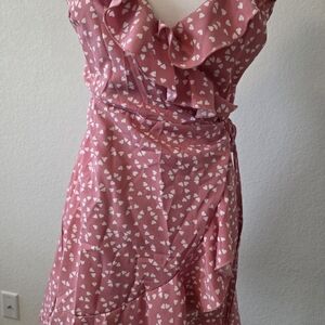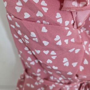 Charming pink dress with white heart print and feminine ruffle details. Features a flattering wrap silhouette and adjustable tie waist for a custom fit. Lightweight and breezy for everyday wear or special occasions. Includes delicate shoulder straps and a flouncy hem for movement.
