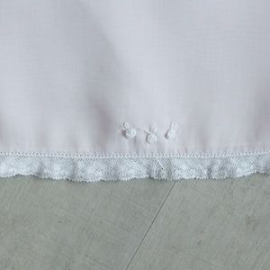 This sweet heirloom dress is beautiful! No longer produced (and one of my favorites!!!) makes this a TREASURE and RARE FIND!!!! Done by Feltman Brothers, this classic, timeless dress has amazing detail. The neckline arms and hem have a lovely matching delicate French lace. No worries of a collar not staying down! Pintucks adorn the bodice and the bottom of the skirt. Gorgeous lace inlays are surrounded by lovely white embroidery. The short puff sleeves gather and the dress has an upper button back. More vertical pin tucks adorn the back of the dress and fall into soft pleats. A matching slip is included and has the same wonderful lace hem and a sweet white floral vine near the lace hem. Gorgeous and New With Tags!