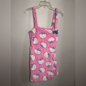 Cozy pink fleece robe dress with Hello Kitty pattern and blue bow accents.