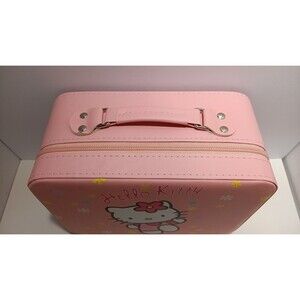 The Pink Hello Kitty Travel Cosmetic Case is a stylish and functional makeup organizer made of faux leather. This non-domestic product features a box shape with a cute Hello Kitty design, perfect for those who love Japanese style. The cosmetic case has a zipper closure and dimensions of 9 1/2" length, 4 1/2" height, and 7" width, making it ideal for storing beauty essentials while traveling. Ideal for fans of the popular Hello Kitty brand, this makeup box adds a fun and colorful touch to your beauty routine.