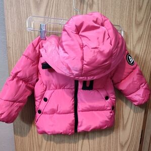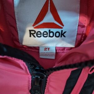 Stylish pink hooded puffer jacket with black accents. Perfect for cold weather. little girl size 2T by Reebok gently used great for fall and winter