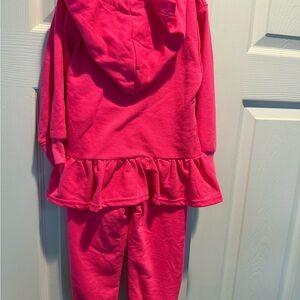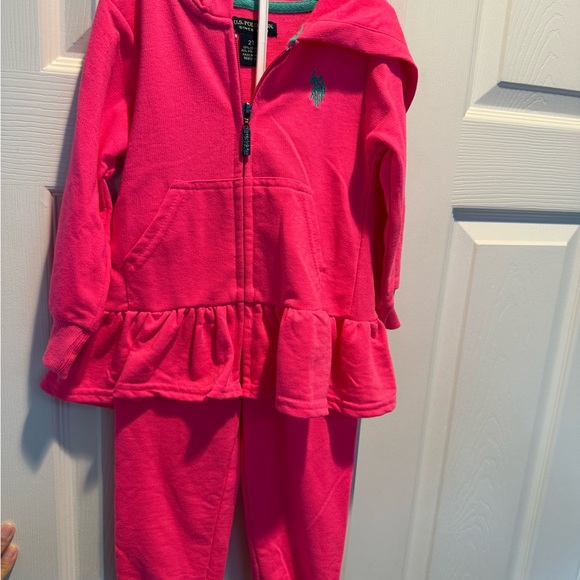 US Polo Assn Bright pink zipper tracksuit with a hood and ruffle peplum detail. Perfect for casual wear. 2T Jacket and pull on elastic pants. 60% cotton, 40% Polyester