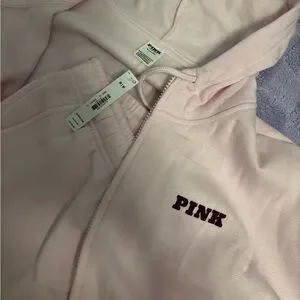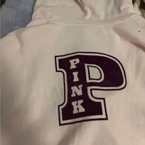 Soft light pink hoodie with dark purple PINK logo. Comfortable and stylish.