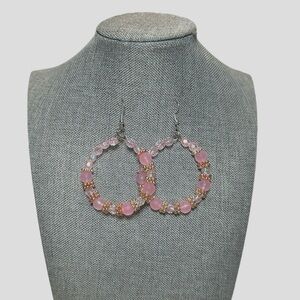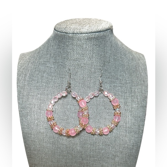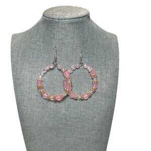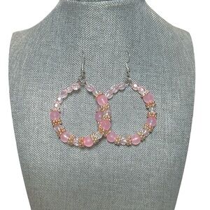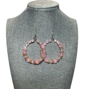 These are 2.5-inch, open hoop earrings adorned with a combination of pink beads and sparkling crystals, sequenced in an alternating pattern. The hoops dangle lightly from silver-toned ear hooks, offering a playful yet elegant look that complements any outfit. Each bead is thoughtfully placed to create a harmonious balance of color and shimmer, perfect for adding a touch of femininity and glamour.