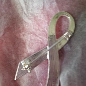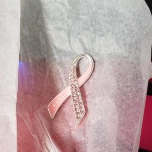 Pink enamel-like finish, and sparkling pink rhinestones come together to create this statement of strength love and support.