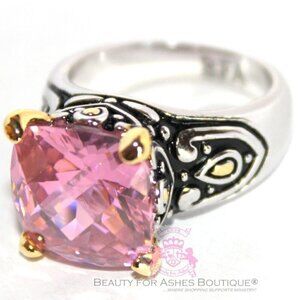 Beauty for Ashes® Throne Room two-tone ring is 12mm square in size White and Yellow Gold Plating with an elegant, old world style ornate setting. The center stone is a checker or checkerboard cut, which is faceted. This makes for a super glittering ring. Perfect for any occasion. Matching pendants, bracelets and earrings are found in our other listings.
