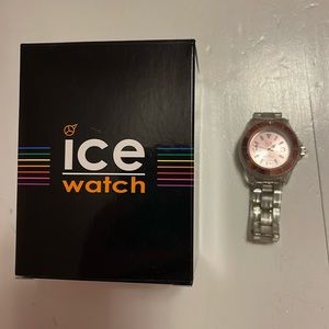 Pink ice watch with clear band. Very good condition. Needs battery. Original packaging included.