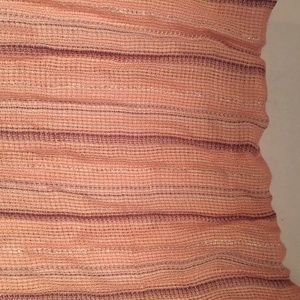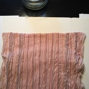 Pink infinity scarf. Approximately 28" x 36" 92% rayon/7% acrylic/1% other material. Light prink, white, purple, light gray and silver metallic. Super soft. Goes with everything.