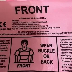 Bright pink inflatable life vest with safety instructions printed on the front. Ideal for water activities.