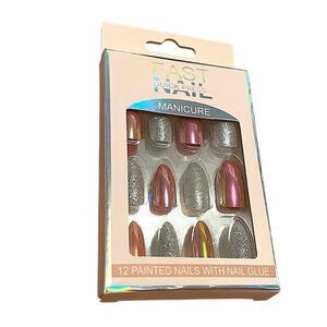 Gorgeous pink iridescent silver glitter press on nails. They are almond shape and medium length. Adhesive tabs are included.