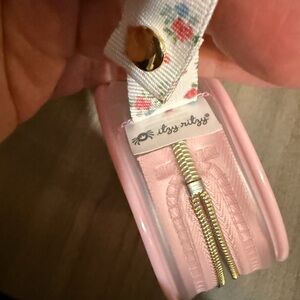 Itzy Ritzy pacifier holder with pink and clear design. Features a floral strap and zipper detail.