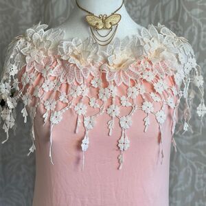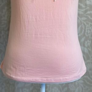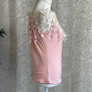 Description: pink stretchy tank top with cream colored 3 dimensional flower crochet detail in US women’s size S/M (please refer to measurements listed below).