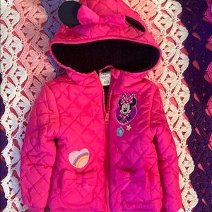 Pink Minnie Mouse Disney Jacket with patches. Black lining inside. Black minnie ears on hood.