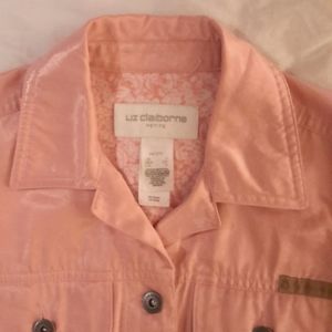 This is a super cute pink jacket, like new. It's a soft cotton blend (64% cotton /36 poly) with a light sheen to it. It's hard to give it up but too large for me (been seating in my closet for a couple of years) . I wore it once. Excellent condition.
