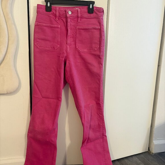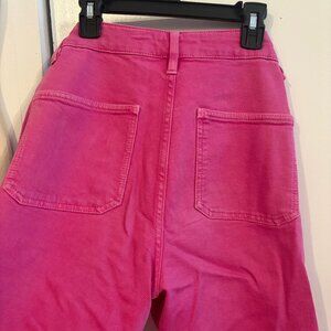Pink high-waisted jeans, two pocks in front and zipper down the middle, around ankle length, wide leg, frayed bottoms