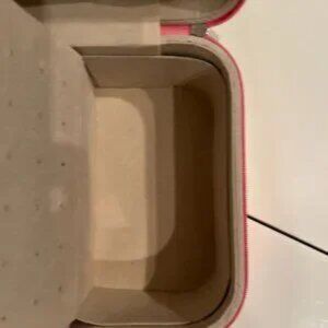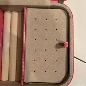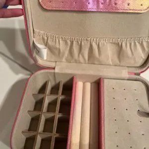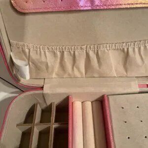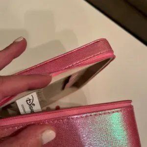 This is a listing for Minnie Mouse jewelry box that has a zipper. It pink and has a sparkly color to it. This is new with its original tags. (I also have some cute Mickey and Minnie Mouse earrings in my closet).