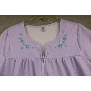 This is a Pink K Purple Full Zip Pajama Gown that is a size XL. It has embroidered flowers around the collar. It has pockets on each side. It is 65% Cotton and 35% Polyester. Laying flat, it measures: Armpit to armpit-20.25" and the length is 40". In good condition but has a couple of spots. See Pics.