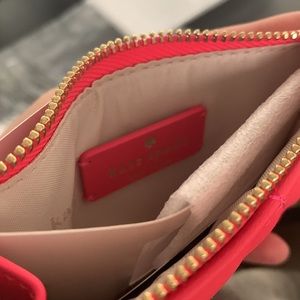 Brand new bright pink Kate Spade wallet with tags. One zipper pocket and card slots in the back. Gold detailing