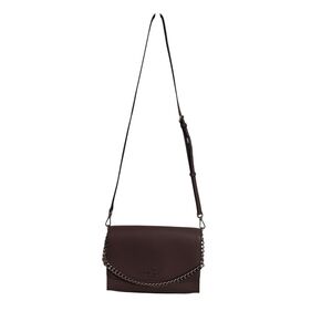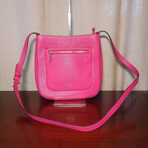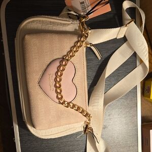 Light pink with a lot of zippers and room inside. Comes with a strap.