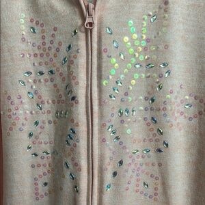 Keep your child warm and stylish with this pink hoodie jacket. Perfect for chilly days.brand new awesome looking jacket very soft to the touch stylish with sparkling gems infront very cool it is size xl 18 1/2 i could not pick this size while listing brand new with tag i love it bought it as present for someone special it did not fit it is a teenager jacket or petite women