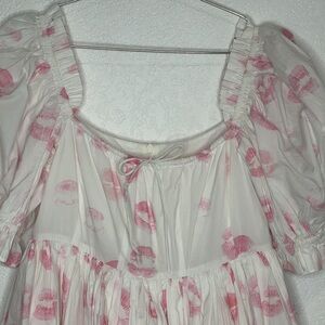 Embrace playful elegance with this charming pink kiss print dress. Perfect for any occasion, it features a flattering silhouette and delightful design.
