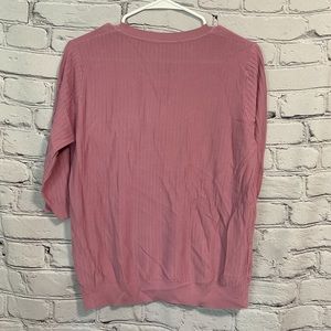 I don’t know the fabric content. This simple chic blouse is so cute with a purple pink color and half length sleeves. The top is plain with ribbed design and it is stretchy. So comfortable.