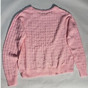 A charming pink knit sweater that exudes cozy sophistication. The intricate woven texture adds depth and visual interest, while the delicate button detailing on the shoulders elevates the design. Ribbed cuffs and hem provide a comfortable and flattering fit. This sweater is perfect for adding a touch of warmth and style to your everyday wardrobe. Imagine wearing it on a crisp autumn day while strolling through a park, or snuggling up with a good book on a chilly evening. It's also a great choice for a casual brunch with friends.