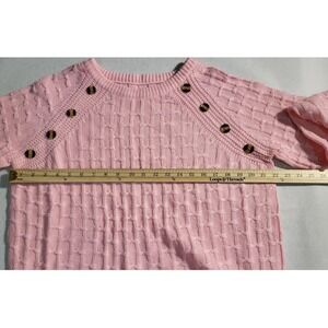 Keywords: pink sweater, knit sweater, button detail, long sleeve, pullover sweater, casual top, woven texture, ribbed cuffs, crew neck, comfortable sweater, stylish sweater, women's sweater, ladies sweater