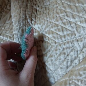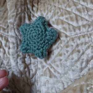 Cute pink knitted star with green edges. Perfect for decoration or gifting.