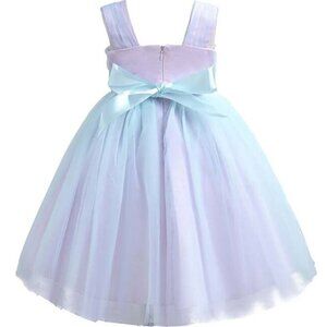 Additionally, the voluminous tulle skirt with hues of blue and pink enhances the dress's playful and graceful appearance, making it perfect for twirling and dancing. Made from a blend of 65% polyester and 35% viscose, this dress ensures both durability and comfort. The zip closure at the back allows for easy dressing and a secure fit.