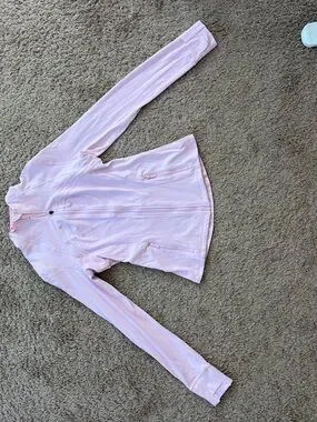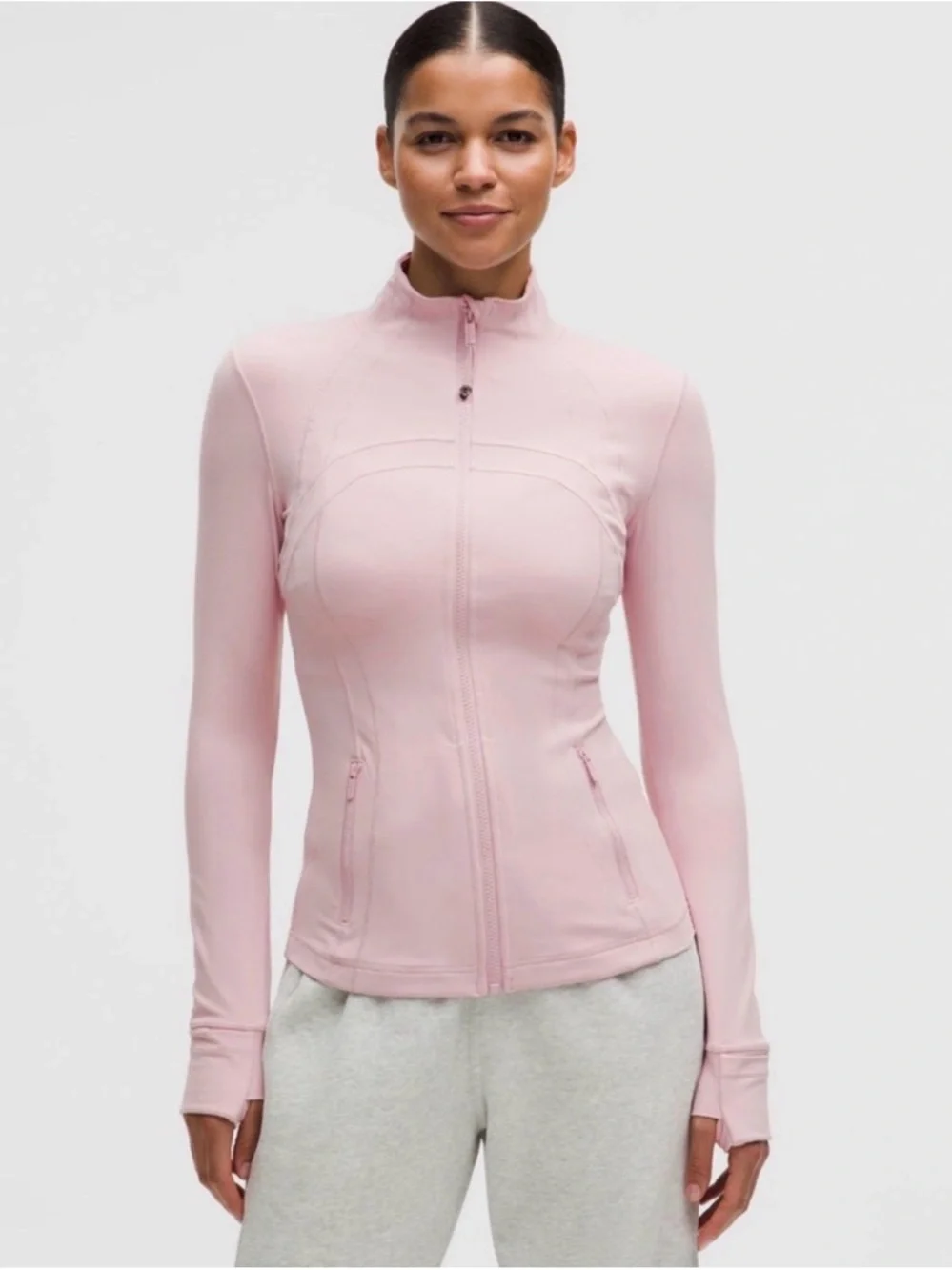 Light pink, fitted zip-front jacket. Long sleeves with thumbholes. Streamlined seams and front zip pockets. Sleek, sporty silhouette.