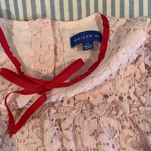 Elegant pink lace dress for kids, featuring a charming red bow. Perfect for special occasions. Worn once and dry cleaned.