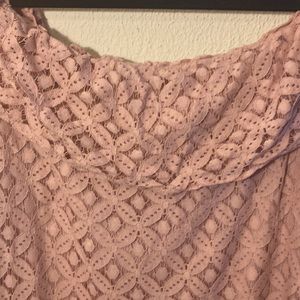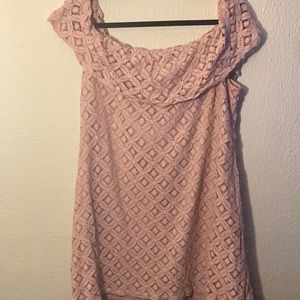 Pink Lace Overlay Dress. Per Seption Concepts. Cotton blend lace. Polyester lining. Can be work on or off the shoulders. Worn once. Like new