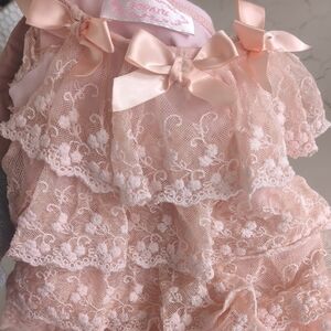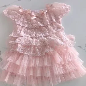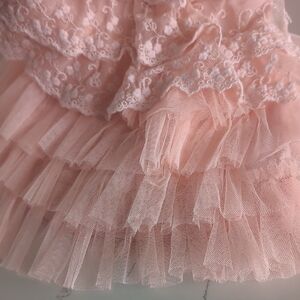 Coral lace dress with ruffle details. Perfect for special occasions or dress up. Size 3 but runs small.
