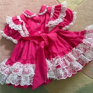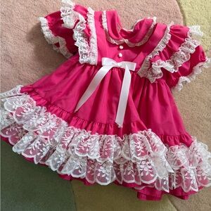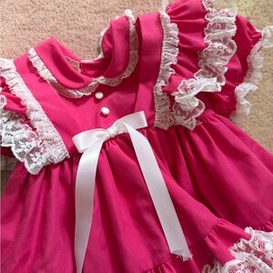 Adorable pink dress with white lace ruffles and a bow. Perfect for special occasions.