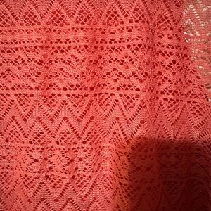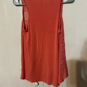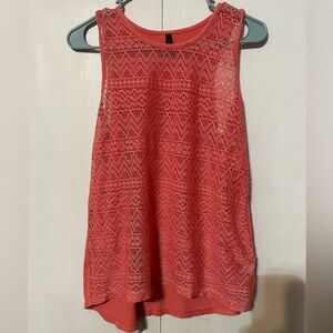 Pink lace tank top. Lace part is see through and is the front of the shirt. Not sure on the brand.
