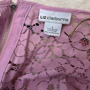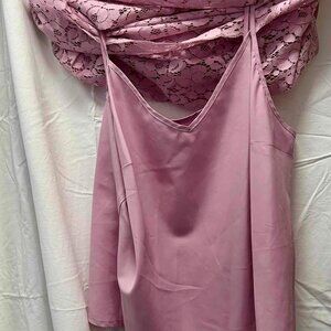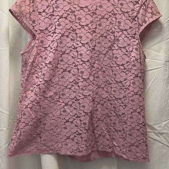 Pink lace top. Fully lined. Falls just below the waist. Snug fit. Cap sleeve.