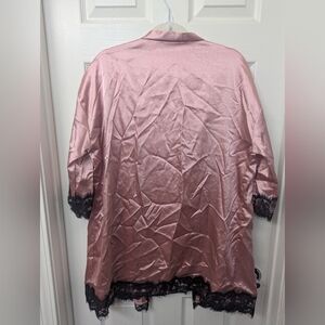 Indulge in comfort with this elegant pink robe featuring delicate black lace trim. Perfect for a luxurious night in.