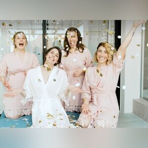 Indulge in comfort with this elegant pink robe featuring delicate lace trim. Perfect for lounging or as a stylish cover-up. Purchased these for my bridesmaids and had 1 extra! It’s one size fits all as a S/M/L. This is brand new in bag! NWOT/in bag.