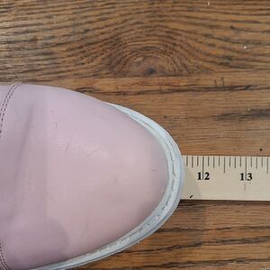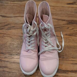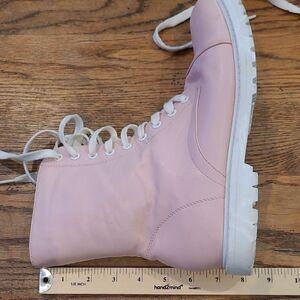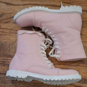 These lace-up boots feature a soft pink canvas upper with a classic combat boot silhouette. The white rubber soles and metal eyelets add a touch of durability to the feminine design, making them perfect for everyday wear.