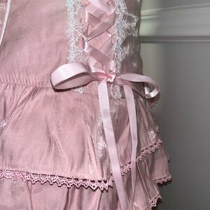 Chic and playful pink skirt featuring lace-up details and ruffled layers. Perfect for adding a touch of elegance to any outfit.